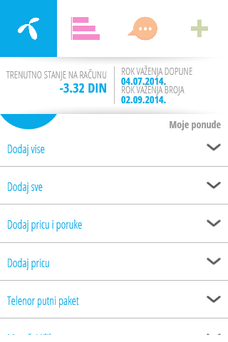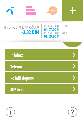 Опис 111 Meni je zvanična aplikacija Telenor d.o.o. Bilo da ste pripejd ili postpejd korisnik, sada u svakom trenutku imate jednostavan pregled i mogućnost aktivacije dodataka i aktuelnih kampanja koji vas zanimaju. Pored toga, tu su i sve informacije o stanju vašeg računa, odnosno iznosu kredita i dopuna, kao i grafički prikaz preostalih minuta, poruka i megabajta. Da biste uspešno koristili aplikaciju, prvi put morate pristupati internetu preko Telenorove GPRS mreže. Svaki sledeći put aplikaciju nesmetano možete koristiti putem Wi-Fi konekcije. Ukoliko se korisnik nalazi u mreži Telenor d.o.o, neće se naplaćivati internet saobraćaj koji nastane korišćenjem aplikacije, kao ni saobraćaj za pristupanje WAP stranici na kojoj se nalazi opis aplikacije i uslovi korišćenja. Protok podataka nastao korišćenjem aplikacije u romingu naplaćivaće se po važećim cenama za prenos podataka u romingu. U slučaju da korisnik ima aktiviranu uslugu Telenor Klik, internet saobraćaj ostvaren korišćenjem aplikacije oduzeće se od besplatnih megabajta u okviru te usluge. Pristup ostalim stranicama kojima se pristupa pomoću aplikacije, kao i korišćenje usluga iz aplikacije, naplaćivaće se po cenama definisanim za te servise. 111 Meni je jedina zvanična Telenor aplikacija. Telenor ne snosni nikakvu odgovornost ukoliko korisnik instalira i koristi bilo koju drugu aplikaciju sličnih funkcionalnosti. Telenor ne savetuje svojim korisnicima ostavljanje svog korisničkog imena i šifre za pristup portalu Moj Telenor aplikacijama koje je razvila treća strana. Ukoliko korisnik ipak to uradi, čini to na sopstvenu odgovornost, rizikujući zloupotrebu ličnih podataka, i nastanak štete za korisnike i Telenor.