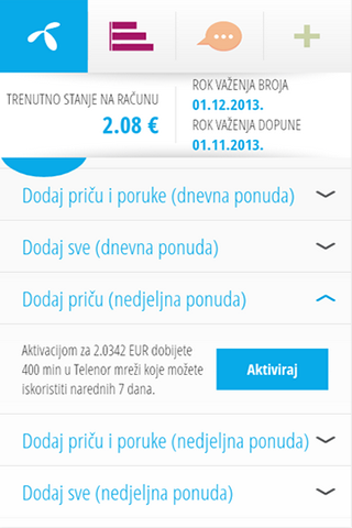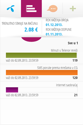 123 Meni je zvanična aplikacija Telenor d.o.o. Bilo da ste pripejd ili postpejd korisnik, sada u svakom trenutku imate jednostavan pregled i mogućnost aktivacije dodataka i aktuelnih kampanja koji vas zanimaju. Pored toga, tu su i sve informacije o stanju vašeg računa, odnosno iznosu kredita i dopuna, kao i grafički prikaz preostalih minuta, poruka i megabajta. Aplikaciju možete nesmetano koristiti preko Telenorove GPRS mreže i putem Wi-Fi konekcije. Ukoliko se korisnik nalazi u mreži Telenor d.o.o, neće se naplaćivati internet saobraćaj koji nastane korišćenjem aplikacije. Protok podataka nastao korišćenjem aplikacije u romingu naplaćivaće se po važećim cijenama za prenos podataka u romingu. Pristup ostalim stranicama kojima se pristupa pomoću aplikacije, kao i korišćenje usluga iz aplikacije, naplaćivaće se po cijenama definisanim za te servise.