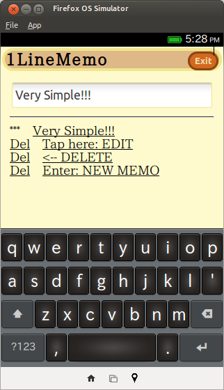 Simple 1 Line memo. *** How to use Enter: Create new memo. Select memo title: Edit the memo. Select [Del]: Delete the memo. Exit: Quit this application.