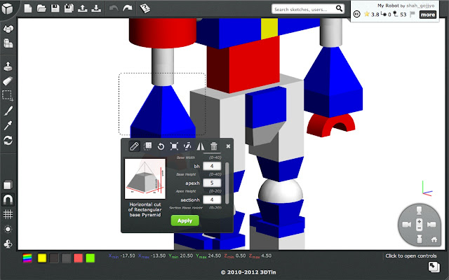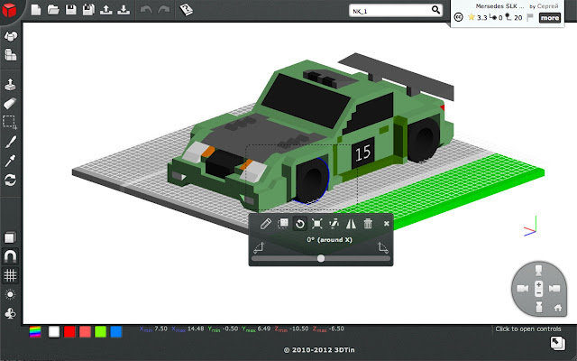 3D Modeling tool that runs in browser 3DTin is a 3D Modeler that runs in your browser. You can .. * design models by placing cubes of different colors on top of each other. * creat shapes from standard templates (WebGL required) * save the sketches in cloud * export the sketches in standard 3D file formats - STL, OBJ, Collada For best user experience, make sure you have WebGL enabled in your browser. For WebGL to work you need a decent graphics card. (If you are still having a problem check this link http://bit.ly/epLszC) Blog: http://blog.3dtin.com Twitter: http://twitter.com/3dtin Facebook: http://www.facebook.com/3DTin