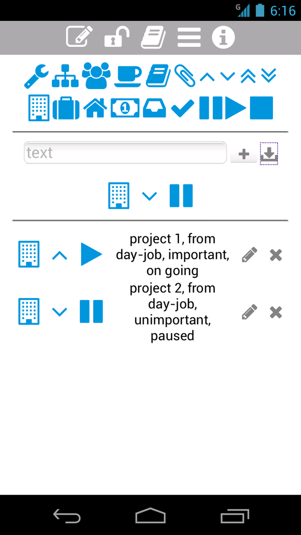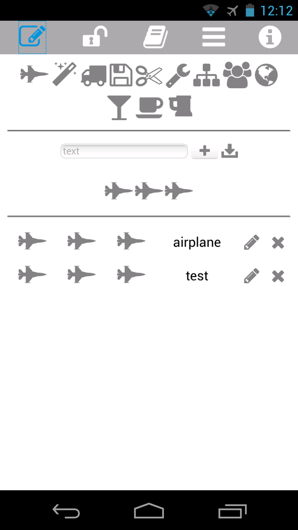 This is an app that can by a game, a note-keeper, or both. You select a combination of icons and insert some text to add it to the list. To get it back you must either have the same combination of icons, or you can press the button that lists all the data. In this way it can be a notepad with icon tags for shorting. It can work as a game if you insert a word filter it out and ask someone else to find the correct combination of icons to get that word (or phrase) You select a combination of icons and insert some text to add it to the list. To get it back you must either have the same combination of icons, or you can press the button that lists all the data. If you press the lock button, the text input field and the show-all button are hidden. To unlock you have to press the same combination that ware active during the locking.