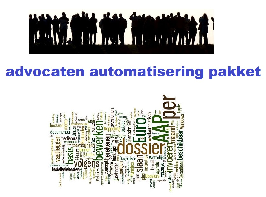 Altijd en overal...... Is het motto van AAP. Waar of wanneer ook ter wereld toegang tot uw gegevens en documenten via internet of uw eigen server, goed geordend per dossier. Zonder investering. Dit is de site van de gebruikersvereniging Advocaten Automatisering Pakket (g-a-a-p.nl). Hier exploiteert, beheert en bewaakt de gebruikersvereniging een stabiele versie van AAP, voor 30 Euro per maand per advocaat. U kunt zich inschrijven voor AAP kosteloos een maand op proef via de website. Het is ook mogelijk AAP op uw eigen server te exploiteren. Dan bedragen de kosten slechts 120 Euro per advocaat per jaar. Nog vragen of wilt u een persoonlijke toelichting? Bel +31 6 1335 7731 .