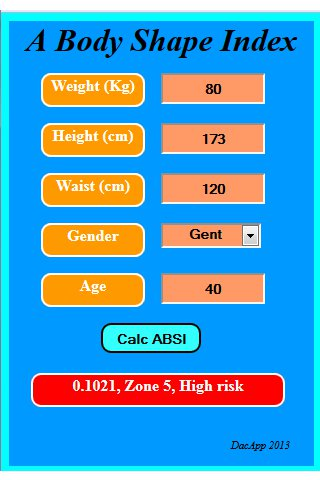 ABSI calculator ABSI (A Body Shape Index) is a recently proposed indicator for evaluating health risks [N.Y.Krakauer & J.C.Krakauer, PLoS ONE 7 (2012) e39504, DOI: doi:10.1371/journal.pone.0039504.t005]. It overcomes the limitations of the commonly used BMI (Body Mass Index) indicator as it takes into account also the Waist Circumference thus permitting to distinguish the effects of fat or muscular mass on the total weight. As an example, imagine two persons with the same height and weight but one being muscular and the other being fat the latter will have an increased health risk than the other. The app asks you for your weight, height, Waist, gender and age and provides the value of the so-called ABSI z-score with an indication of the risk zone (from 1 to 5) as described in tab 4 of the PLoS ONE paper. Zones 1 to 3 correspond to low risk, zone 4 to moderate and zone 5 to high risk. A recommendation: measure carefully your waist circumference as the value of the ABSI z-score is highly dependent on this body parameter.