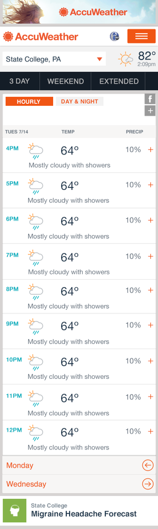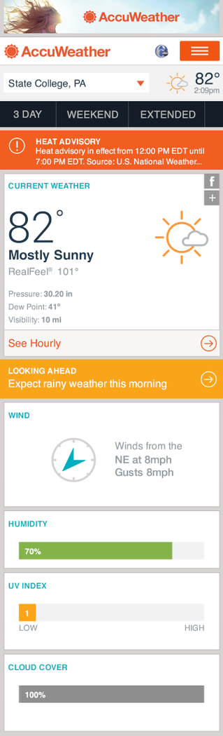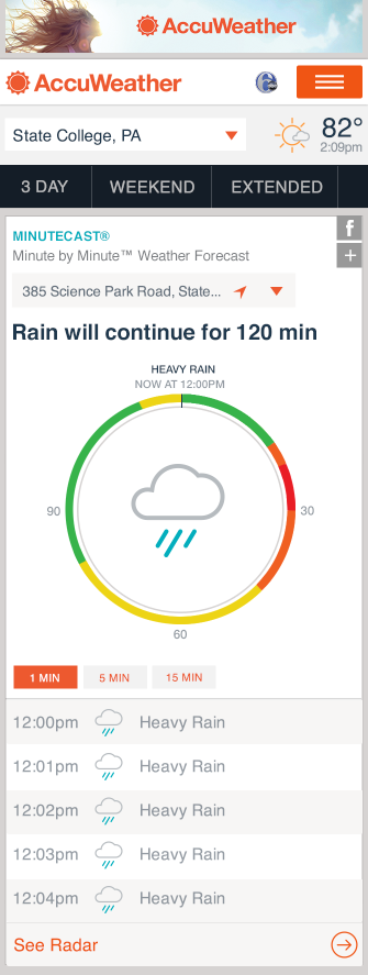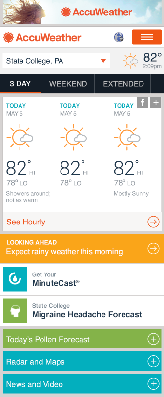 Weather at your fingertips – local and international weather forecasts AccuWeather provides accurate, local and reliable weather news and information that you need to help you plan your life, protect your business and get more from your day! Featuring hourly and Minute by Minute™ forecasts with Superior Accuracy™, AccuWeather provides detailed weather forecasts for locations worldwide in 36 different languages. AccuWeather also includes animated radar and satellite maps as well as broadcast quality weather videos and news. With consistent navigation, modern icons and a fresh design, AccuWeather’s mobile website gives users a refreshing and intuitive user experience. AccuWeather is free, fun-to-use and will make all the difference in your day!
