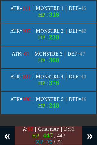 Un simple jeu où le joueur dispose de 3 personnages (guerrier,archer et mage) avec lequels il doit tous faire pour vaincre les 5 monstres qui lui font fasse.