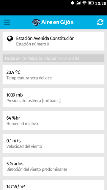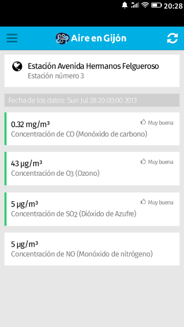 Datos del aire en la ciudad de Gijón (Asturias). Consulta en tiempo real los valores de las estaciones de la Red de Vigilancia situadas en Gijón (Asturias, España). Podrás ver la contaminación y saber si el nivel es saludable (usando el criterio descrito en el Real Decreto 102/2011) de los siguientes valores: Dióxido de Azufre (SO2), Ozono (O3), Monóxido de carbono (CO) y las Partículas en suspensión. Adicionalmente (cuando está disponible) se puede consultar la temperatura, presión, viento (velocidad y dirección), humedad, radiación solar, precipitaciones, Dióxido de nitrógeno, y concentraciones de más elementos (Monóxido de nitrógeno, Xileno, Tolueno y Benceno). Los datos utilizados son publicados por el Ayuntamiento de Gijón utilizando OpenData: http://datos.gijon.es/set/medio-ambiente/calidad_aire_ultimos (se actualizan cada hora). Lista de cambios resumida: v2.0 - Aplicación reescrita desde cero. - Mejorado el rendimiento y la velocidad. - Cambiado el DataSheet del Ayuntamiento por otro más actualizado. - Más datos disponibles. - Reducción de las librerías utilizadas, actualizadas las restantes. v1.1 - Mejor categorización. - Mejoras visuales. v1.0 - Ver información básica de las estaciones.