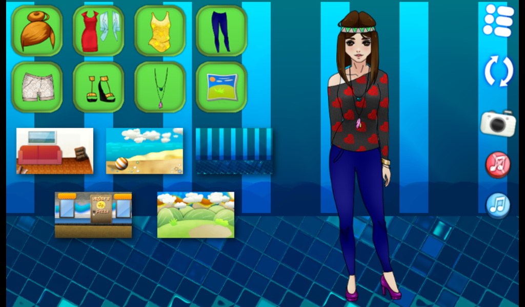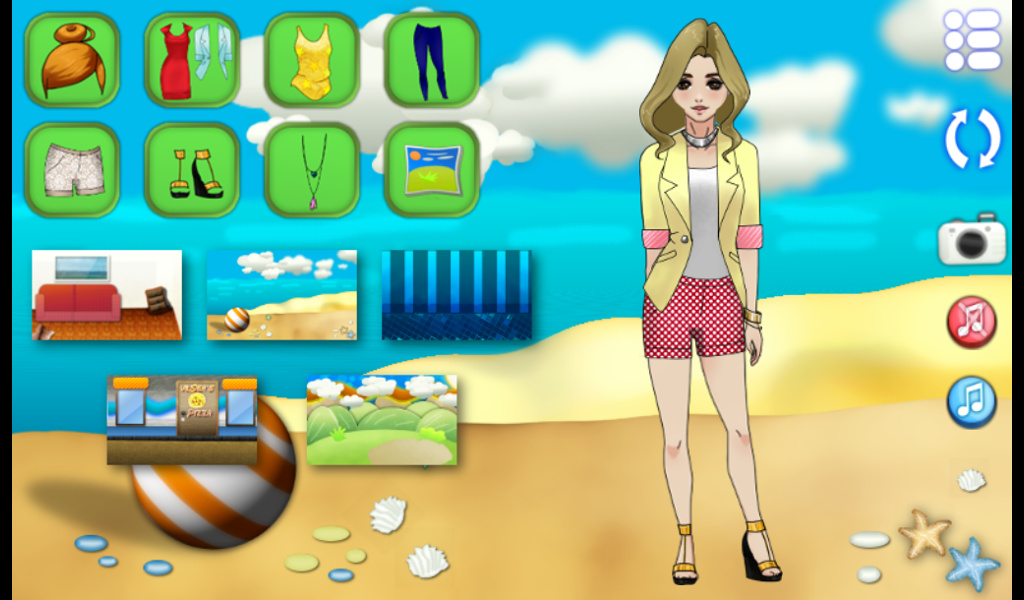 Help Amelia to get stylish in this lovely dress-up game. Get creative and find your favorite style. There is nearly one hundred items to choose from in five categories like: dresses, T-shirts, shorts, skirts, sweaters, skirts, accessories, shoes, shirt and also some different hairstyles. Once you are finished to dress-up, finally pick one of the backgrounds and just click snapshot button to preview Amelia in fullscreen.