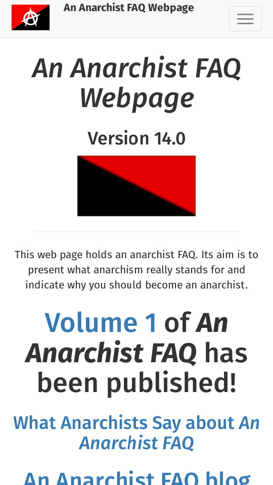 This FAQ was written by anarchists across the world in an attempt to present anarchist ideas and theory to those interested in it. It is a co-operative effort, produced by a (virtual) working group and it exists to present a useful organising tool for anarchists on-line and, hopefully, in the real world. It desires to present arguments on why you should be an anarchist as well as refuting common arguments against anarchism and other proposed solutions to the social problems we face.
