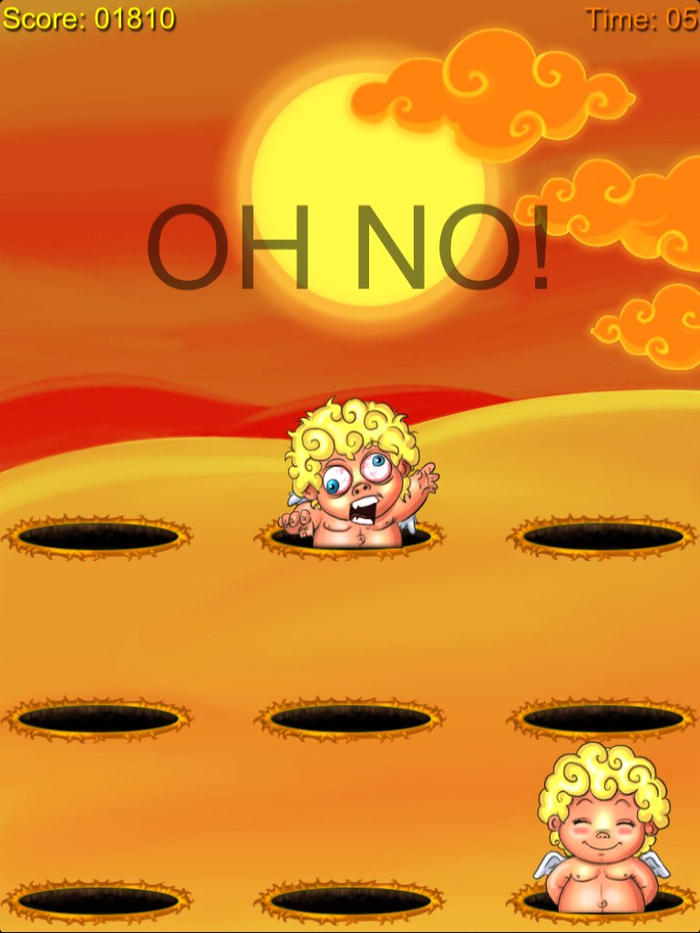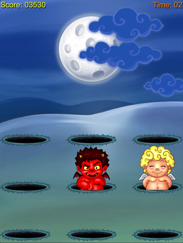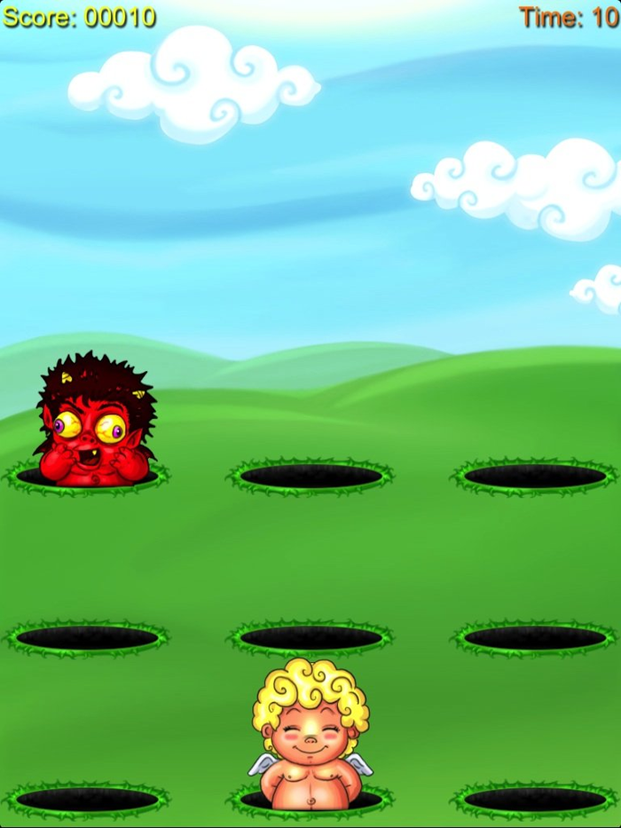 Hit the devil's heads which pop out of holes and avoid hitting the angels.