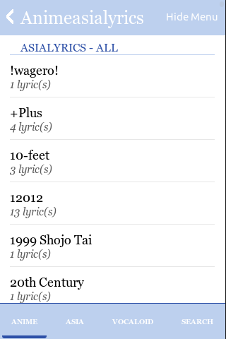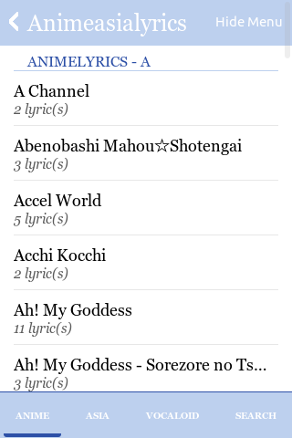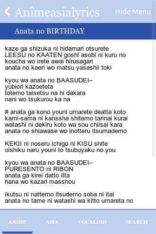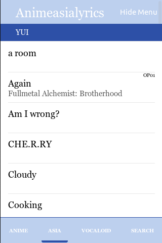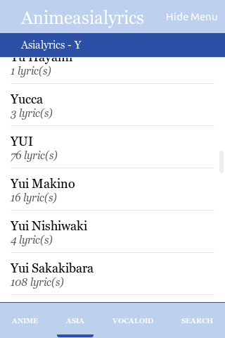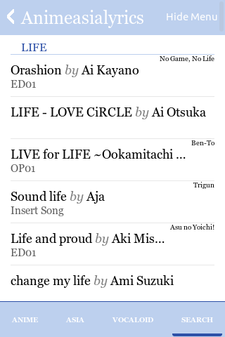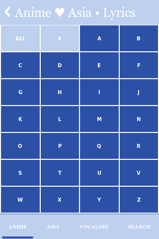 Web app du site animeasialyrics.fr, site consacré aux paroles de chansons d'animes, les génériques (opening, ending, insert song) mais également des paroles (lyrics) de chansons d'artistes asiatique et Vocaloid.