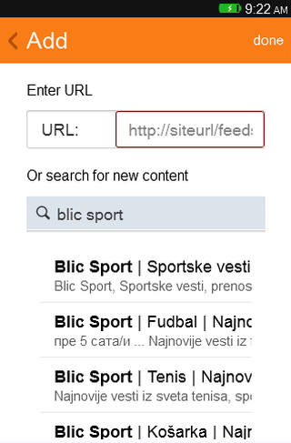 - Add feeds by URL, or search for new feeds.
