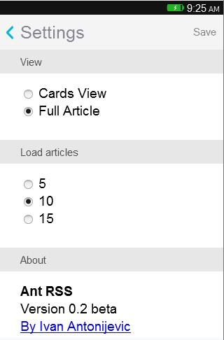 Ant RSS - Simply RSS reader. It allows you to follow your favorites RSS feeds. No login required. Ant RSS use Google rss API for parsing and reading feeds. You can add feeds by typing URL, or use search box for discover new feeds. In next version OPML import will be available too. This is my first FFOS application, and it is beta version. Features v 1.0.1 beta
