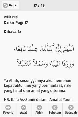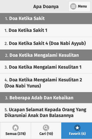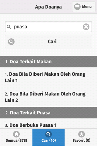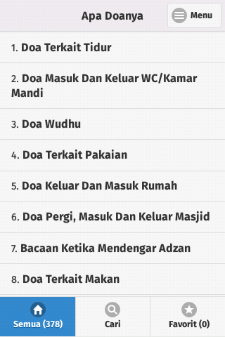 Assalamualaikum, Kaum muslimin, apakah anda pernah mengalami: -Anda ingin memulai suatu aktivitas, ingin berdoa seperti yg diajarkan Nabi, namun anda tidak tahu apa doanya? -Anda mengalami kejadian yg menyenangkan/menyusahkan, ingin berdoa sesuai yg dicontohkan Nabi, namun tidak hafal lafadz-nya? -Anda sering lupa lafadz doa/dzikir yg anda baca? Tercampur satu dgn yg lain? -Anda punya buku kumpulan doa/dzikir lengkap, tapi malas membukanya, harus mencari di daftar isi, tidak selalu dibawa karena tebal/berat, dll? -Anda sudah mencatatnya di gadget, tapi kemudian bingung mencarinya, lupa dimana menyimpannya, menghabiskan waktu, dll? -Semua hal di atas membuat anda merasa berat, sehingga anda malah jadi jarang berdoa/berdzikir?? Bila ya, maka semoga hal berikut bisa sedikit meringankan beban anda. Alhamdulillah, kini telah hadir app "Apa Doanya"! Keutamaan: -Memuat 370+ doa, dzikir, adab dll! Bersumber dari Quran & Hadits Shahih/Hasan (insyaAllah, sesuai penelitian ahli hadits), anda bisa dgn tenang mengamalkannya! -Dilengkapi Dzikir Pagi Sore & Dzikir Setelah Shalat Fardhu! Cocok dijadikan app wirid/doa harian anda! -Fitur "Cari"! Mencari doa/dzikir yg anda inginkan, tinggal ketik! -Fitur "Favorit"! Punya doa/dzikir yg anda senangi? Simpan ke favorit agar mudah dimunculkan lagi! -Ukuran teks bisa diubah! Teks arab/lainnya terlalu kecil? Silakan ubah sesuai selera anda! -Bekerja offline! Tidak perlu internet saat menggunakannya! -GRATIS!! Tidak dibatasi waktu, tidak ada fitur yg dimatikan, semuanya FULL! Semoga kita semua menjadi muslim yg banyak berdoa/berdzikir di setiap keadaan. Mohon sebarkan. "Siapa yg menunjukkan kpd kebaikan, maka ia akan mendapat pahala seperti orang yg melakukannya." HR. Muslim 3509.