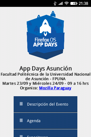 Información sobre el taller Firefox OS “App Days Asunción” del evento MozPY Week en el ETyC 2014, a realizarse el día Martes 23/09 y Miércoles 24/09 – 09 a 16 hrs, en la Facultad Politécnica de la Universidad Nacional de Asunción UNA. Avenida Mariscal López. San Lorenzo, Paraguay.