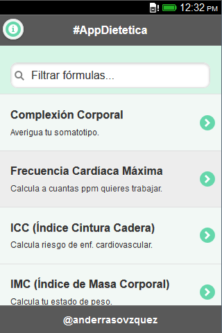 Este proyecto tiene la finalidad de ser una herramienta útil y sencilla de usar con la que valorar el estado de salud de los individuos. Ha sido desarrollada por Ander Raso, Técnico Superior en Dietética y Nutrición, actualmente estudiante de medicina en la EHU y aficionado a la programación (@anderrasovzquez), podéis contactar o enviar sugerencias a ese Twitter.