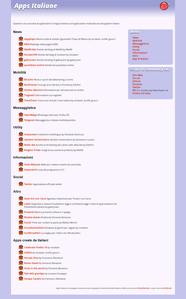 Gallery of Italian Applications, part of them made by Mozillians of the Italian Community. ------------------------------------- Galleria di applicazioni per Firefox OS in Italiano, parte di queste sono sviluppate da volontari Italiani.