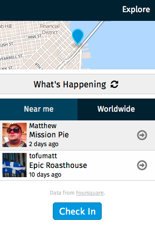 Mozilla-supported HTML5 Foursquare client. Check-in to nearby venues, upload photos to venues, see what your friends are up to, and explore what's nearby when you're at home or traveling! Source code is available on GitHub.