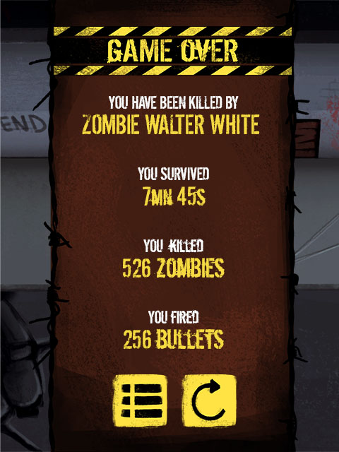 It’s time to lock and load and to take everything you can use as a weapon. Confront masses of disgustingly absurd zombie in a post-apocalyptic universe with “At the end, Zombies Win”. Put your reflexes to the trial, as well as your speed and your management ability and prove to the world that you will not let yourself get eaten! It’s not every day that you end up being the only survivor of a zombie apocalypse… well yes, it’s become a cliché now but anyway… To survive, you’ll have to find a way to leave the city and to kill all the zombies on your way before you end up as a full-course meal for a group of those putrefied freaks. “At the end, Zombies Win” is an arcade game in which you have multiple weapons to kill an infinite number of zombies that try to kill you in a closed arena. You must avoid being caught by the undead as long as possible and also manage you stock of ammunitions. The longer you survive, the more money you can collect to upgrade your arsenal. Survive an infinite succession of waves of zombies that gets more and more intense and in which the creatures will become stronger and stronger. Destroy as many zombies as you can and prove that you are the king of survival. CARACTERISTICS -Multiples weapons -Hundreds of zombies -Best score At the end, zombies win is an amusing game for the whole family! Only recommended for... everyone!