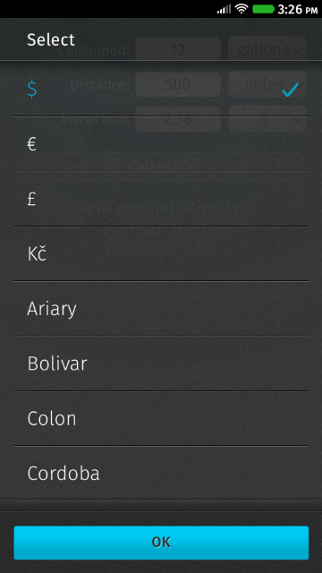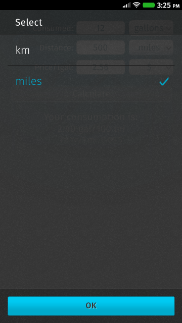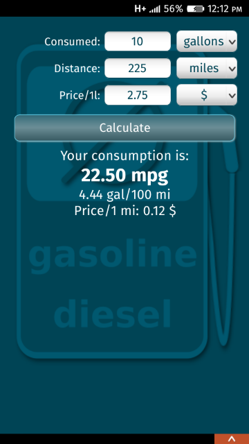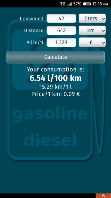 Simple calculator to calculate the average fuel consumption. Application supports imperial (mpg) and metric (l/100km) units. Functions of the Calculator: - calculation the average fuel consumption - calculation the price per unitary distance