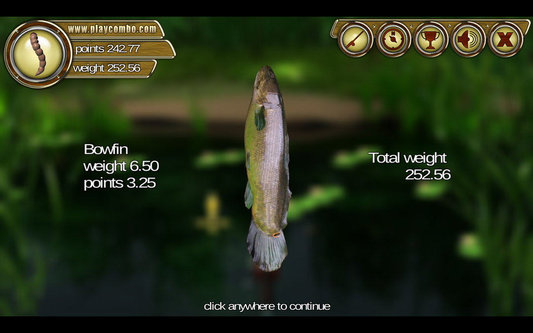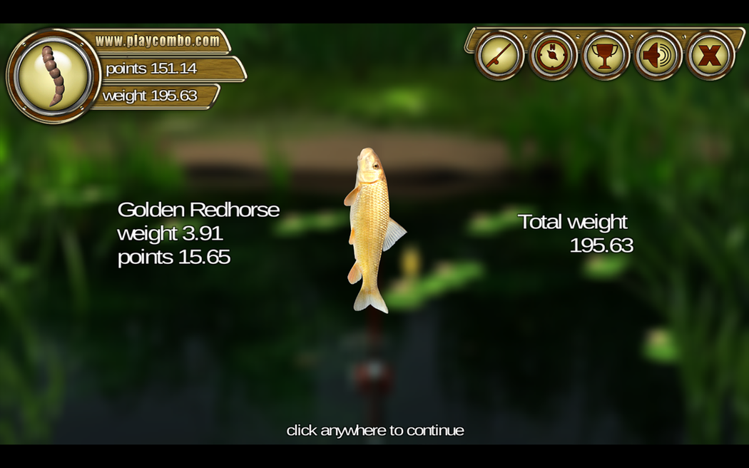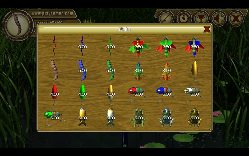 Backwater Fishing is the realistic fishing game from playcombo.com. If you want to relax and unwind while enjoying the sounds of nature and to watch the fish in the water, You need to play the game Backwater Fishing. Instructions: Select the place for fishing. Use your mouse to throw the bait and wait for the fish. You will need to try to pull the fish out of the water. Pay attention to the red line, it shows the tension of the fishing line. If the red line will fill the entire circle, there is a danger of losing the fish. You can catch so much fish, how many you will be able and earn points. And you will be able to buy additional baits, rods, places.
