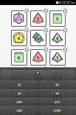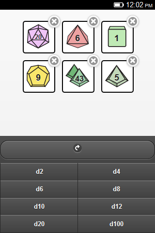 Mobile app for rolling dice. Supports 2,4,6,8,10,12,20, and 100-sided die.