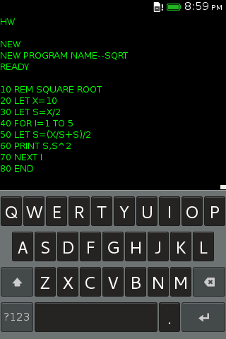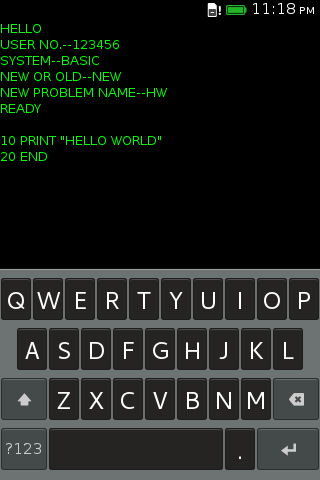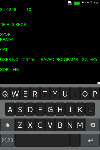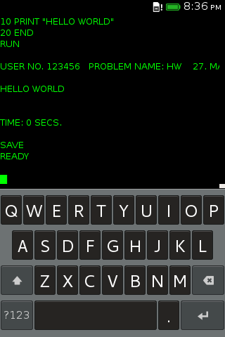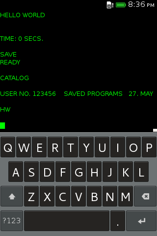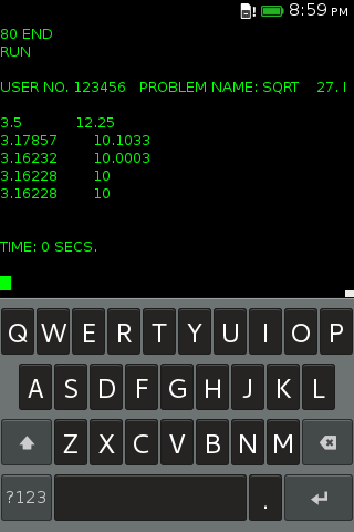 30. april 1964 the very first Basic ran at Dartmouth University. To celebrate the fifty years anniversary this is a fully functional simulation of the original Basic and the Dartmouth Time Sharing System. This early version of Basic was indeed rather basic, and had no facilities for neither user input nor string handling. An original manual can be found at http://bitsavers.informatik.uni-stuttgart.de/pdf/dartmouth/BASIC_Oct64.pdf The simulator starts with a login sequence, as seen on the picture. Give any user number consisting of six numbers or a letter followed by five numbers, e.g. 000000 or 123456. It then asks if a new or saved (old) program is wanted. Type new here first time. Program execution can be interrupted by typing 'S' for STOP, in case of infinite loops. A 25x80 character monitor i simulated, so it might be nessecary to scroll to see everything.
