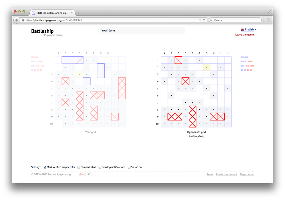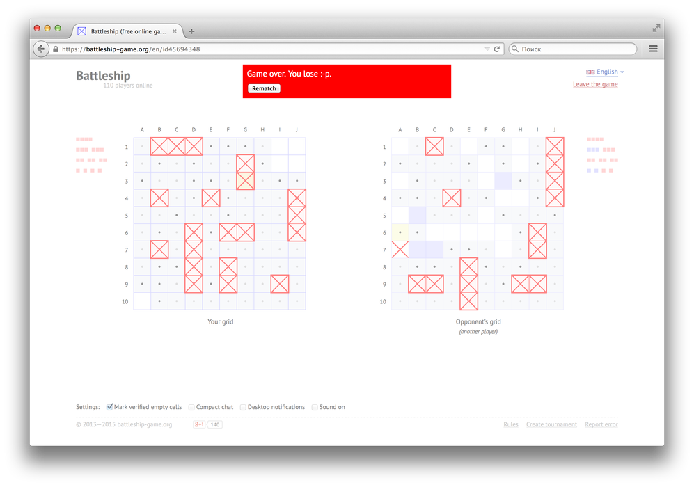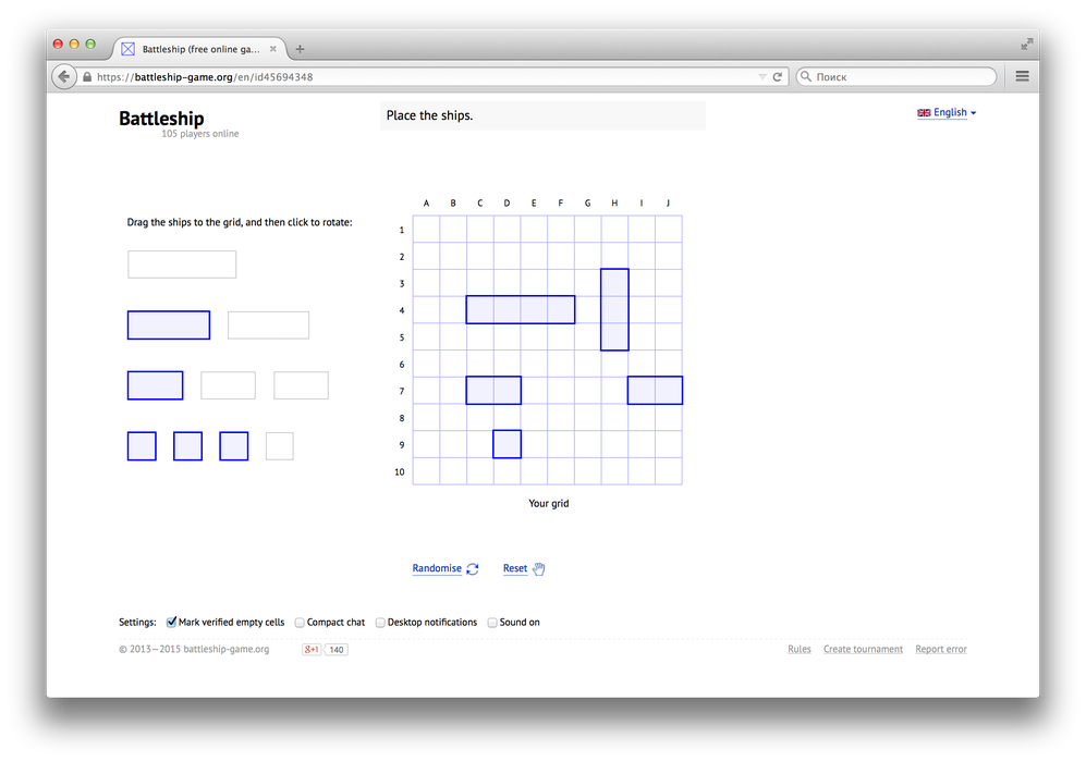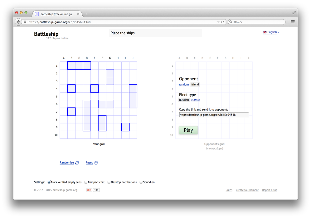 Battleship — online game for 2 players. Arrange ships, wait for opponent and start playing. The classic “Battleship” game on field 10 × 10 cells with real opponents. Key features: 1) no flash pleer required; 2) select the type of opponent — friend or random; 3) arrangement the ships manually or randomly; 4) saving the last position of ships; 5) chat with opponents; 6) playback sounds at various events; 7) multilingual; 8) https support.