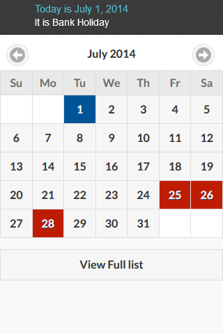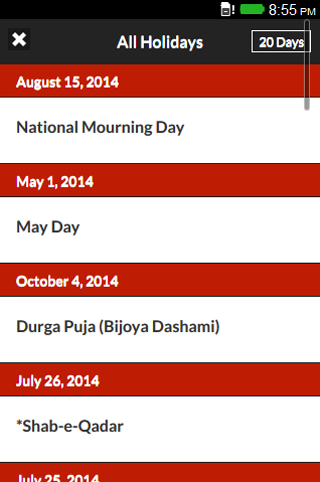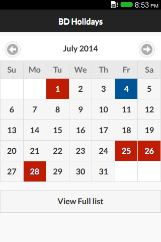 This app shows Bangladesh Holidays, all the data are getting from Bangladesh Bank website. * Swipe support on month changes and going back * Current date show * Generates notification if current date has a Holiday * Show red marked date for holidays * All Holidays list show * Tap on date to see details