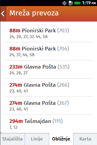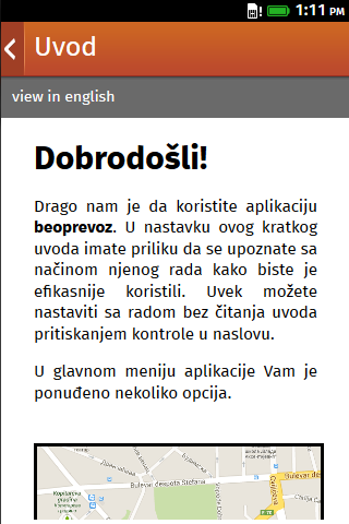 English If you are visiting Belgrade and need a hand with public transport, this is the app for you! With full and up-to-date information on Belgrade's public transit systems, a shortest route calculation feature, integration with Google Maps and Google Places Search and GPS geolocation support, Beoprevoz makes your navigation in Belgrade a breeze. Use the "nearby stations" feature in the transport network screen to see what your nearby public transport options are, or search for your destination, pinpoint its location on the interactive and high-quality Google-provided map and view the directions for reaching it from your current location. You are in a bus and have no Internet access? No problem! All the data is stored on your phone so the only feature you won't be able to use without Internet is Google-provided places search and Google Maps. Everything else, including "nearby stations" and "directions" features works just as fine. Srpski Bez obzira na to da li posećujete Beograd i potrebna Vam je pomoć u kretanju gradskim prevozom ili ste stanovnik koji želi da dođe do sasvim nepoznatog mesta, Beoprevoz je aplikacija za vas! Uz pune i maksimalno ažurne podatke o sistemu javnog prevoza u Beogradu, mogućnost izračunavanja najkraćeg puta, integraciju sa Google Maps i Google Places Search servisima i podrška za GPS lociranje, Beoprevoz čini Vaše kretanje kroz Beograd lako kao nekoliko poteza po ekranu Vašeg telefona. Koristite "obližnje stanice" na ekranu mreže prevoza kako biste videli kakve su Vam trenutno opcije što se gradskog prevoza tiče, ili potražite vaše odredište, prikažite njegovu lokaciju na interaktivnoj i kvalitetnoj Google mapi i dobijte uputstva za dolazak do njega od Vaše trenutne lokacije. Nalazite se u busu i nemate pristup Internetu? Nikakav problem! Svi podaci se skladište na sâmom telefonu tako da su Google servisi (mape i pretraga mesta) jedina mogućnost koju nećete moći da koristite bez Interneta. Sve osim toga, uključujući "obližnje stanice" i "uputstva" radi bez problema.