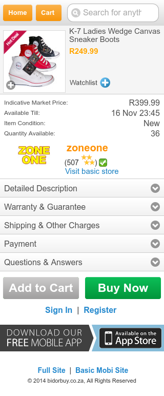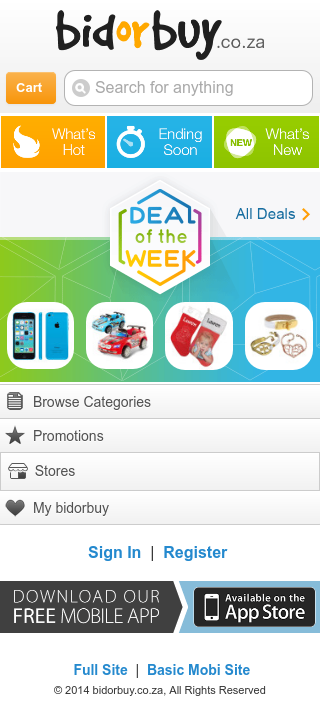 The bidorbuy app provides an interactive and convenient mobile shopping experience for users with Firefox OS devices. With an attractive interface and intuitive navigation, the bidorbuy app for Firefox OS makes it easy to browse, bid or buy, shop and manage your bidorbuy activity from your mobile device. The bidorbuy app is available for both the South African and Kenyan bidorbuy marketplaces. Buying Features: ✓ Browse through products by category ✓ Search for products by keyword ✓ Refine your search using easy-to-use filters ✓ Create and view saved searches ✓ Receive email notifications for matches to your saved searches ✓ Bid or buy products across thousands of categories ✓ Respond to classifieds ✓ View our latest promotions such as Deal of the Week, Crazy Wednesday and Snap Friday ✓ View full item details including shipping and payment options ✓ Make payments using: bobPay-EFT, Cash Deposits, bobPay-Credit Card, MPESA (Kenya only) and bobBucks. ✓ Add items to your watchlist and shopping cart ✓ Keep track of your bidorbuy activity ✓ Setup and receive bidorbuy SMS outbid notifications ✓ Ask questions and view answers from sellers ✓ Review seller ratings and leave your own feedback ✓ Share listings Socially via email, Facebook and Twitter ✓ Switch between South African and Kenya bidorbuy marketplaces (separate accounts are required for each marketplace) Account Management ✓ Register on your device ✓ Change your details ✓ Access My bidorbuy features ✓ Access bidorbuy contact details