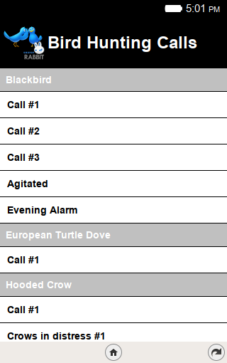 Don't spend your money on buying expensive electronic callers. Try the SourceRabbit Bird Hunting Calls and make your upland hunting easier. Bird Calls for: * Blackbird * European Turtle Dove * Hooded Crow * Magpie * Quail * Song Thrush * Tufted Duck and many more are coming.... Best of luck and happy hunting! Like us on Facebook: https://www.facebook.com/SourceRabbit NOTE: Please check your local game laws for legal use of electronic hunting calls. Disclaimer: This app is supported via ads. This is a way to make money from this app and giving it to you for free. Thank you for your understanding. Keywords: Bird Hunting Calls, Upland Hunting, Game Calls
