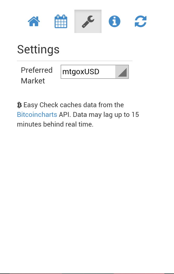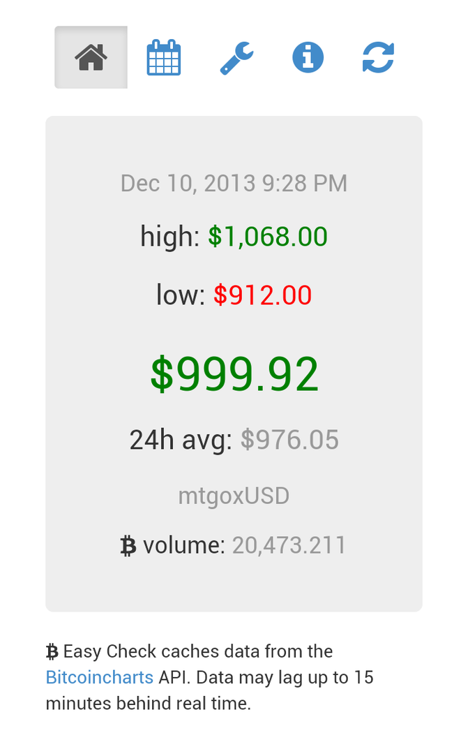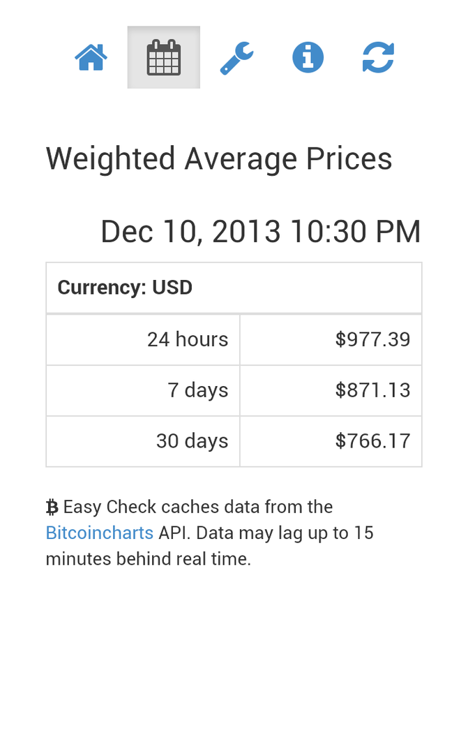 Easily check the price of Bitcoin, for any market and currency, as well as the current day’s statistics. See the weighted price averages for the last 24 hours, 7 days, and 30 days for the currency of your choice. The Bitcoin Easy Check backend server caches data from the bitcoincharts.com API and may lag 15 minutes or more behind real time.