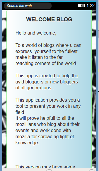 Its an application developed to benefite the users in accesing the abundent source of knowledge shared by people from around the world in the form of blogs . This app is created to help the avid bloggers or newbies in bloging world . This application is a tool to share your work and your feelings about it . It will prove helpfull to the mozillians who blog about their events and work done with mozilla for spreading light of knowledge. This application provides an easy and convinient enviornment for the user of all age group .