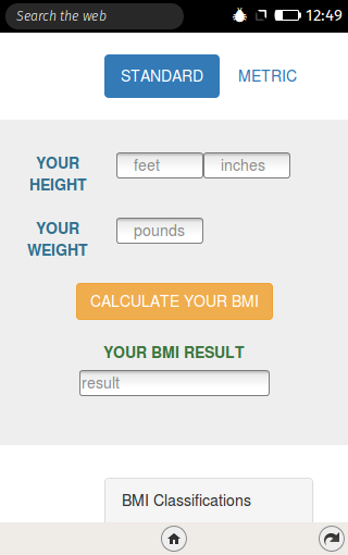 This is an app to claculate your BMI (Body Mass Index). Body Mass Index or Quetelet index, is a measure of relative size based on the mass and height of an individual. This can app stake the input in standard form or metric for and generate the result. The result obtained can be compared with the BMI Clasification Table. Eat Well! Drink Well! Exercise Well! Use the App Well!