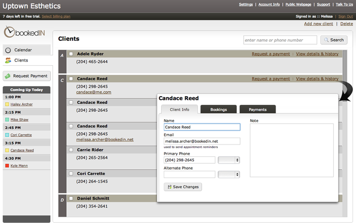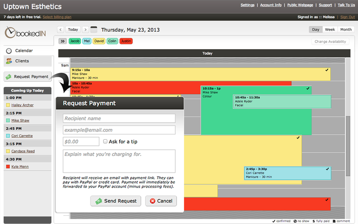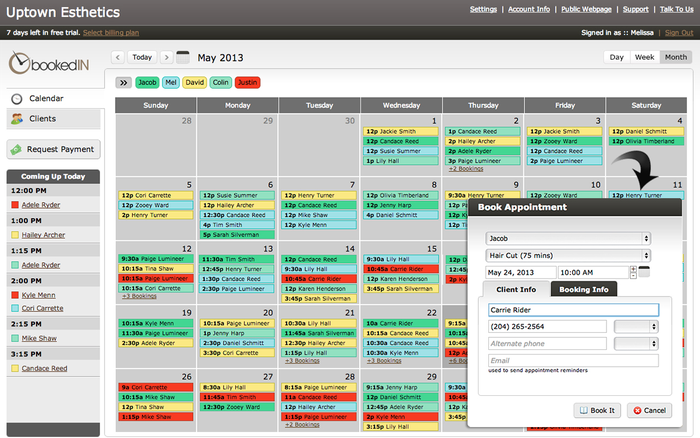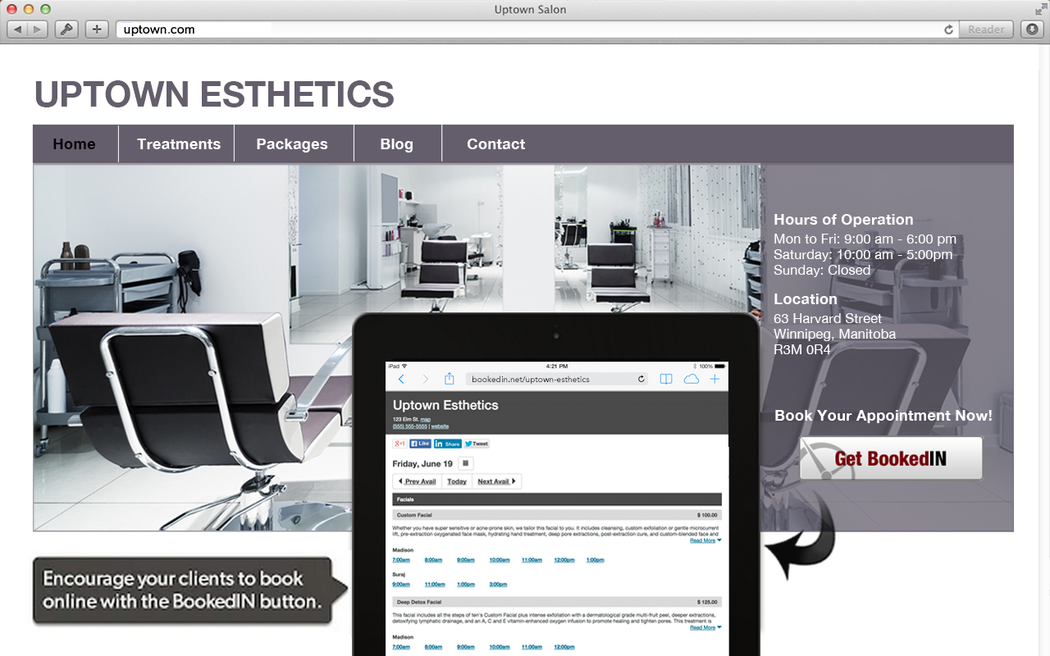 BookedIN is an online service designed to help small businesses promote their services, book online appointments and collect payments. Secure, easy to use and accessible from anywhere. ----- FEATURES: * Business Web Page We'll publish your services on your very own public web page. Your clients can browse available appointments and book online 24/7. * Payment Processing Accept deposits, partial payments or even full payments when booking or anytime after. Clients can pay by credit card, debit or PayPal. All you need is a PayPal account and we'll do the rest! * Online Calendar Log in and manage all your schedules in one place, at anytime, from anywhere. * Client Database Store important client details and find contacts quickly and easily. * Custom Client Emails Automatically send custom reminder emails and booking notifications. Clients can confirm, cancel or pay right from the email. * Custom Booking Forms Request custom information when they book. Perfect for getting to know new clients, or collecting specific details for each booking. * Website Integration Add a booking widget or button to your website. Works with WIX, WordPress, Squarespace, 1&1 or any other website. * Social Integration Let your clients book from your Facebook page or Instagram profile. * Calendar Sync Sync your BookedIN appointments with you favorite calendar including: Google Calendar, Outlook, iCal, iPhone and many others. * Staff Notifications Instantly notifies you or your staff when a new public booking is made. * Multiple User Logins Create unique user accounts to control what your staff can and can't access. * Secure And Reliable Our software runs on Google App Engine, the most secure application platform in the world. Data is backed up continuously so you'll never lose your information. So what are you waiting for? SIGN UP for a FREE 30 day account!