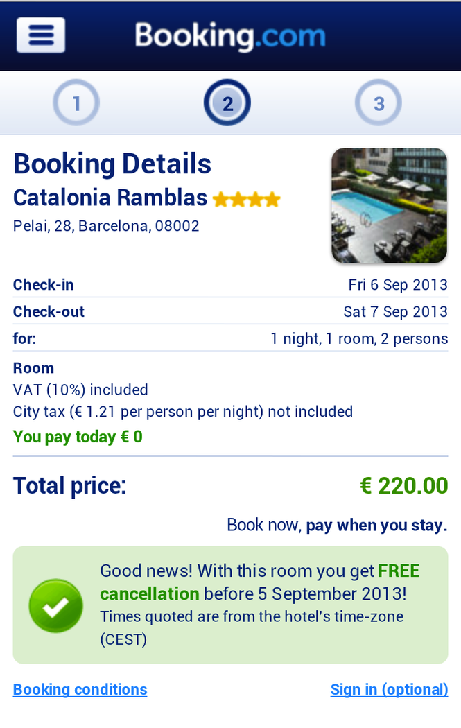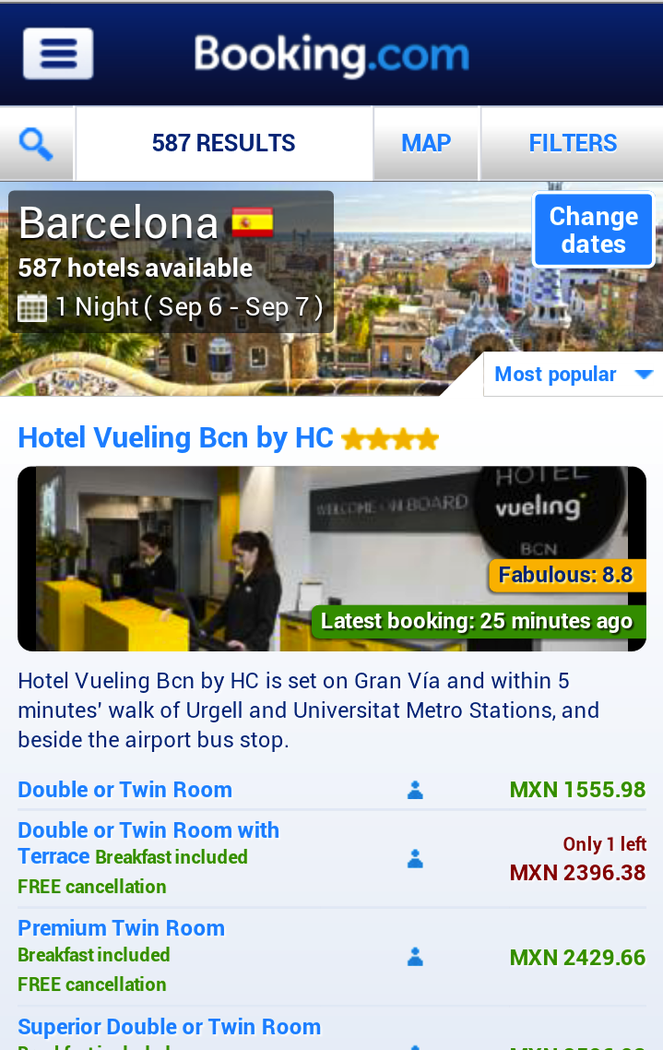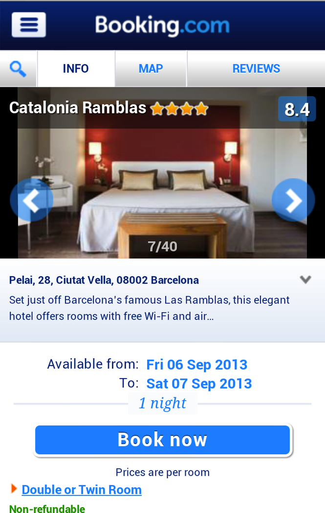 Booking.com puts over 530,000 properties at your fingertips for simple and secure booking on your mobile. Find ideal accommodations – anywhere, anytime – best price guaranteed. FIND PROPERTIES FAST - For last-minute bookings, view available hotels near you for tonight in one tap. - If you already know where you want to stay, search by hotel name or landmark to find your favorite spot fast. - Or you can search for over 70,000 destinations worldwide. GET THE BEST HOTEL DEALS Looking for more than just cheap hotels? We showcase the best deals at all kinds of amazing properties. - Late Deals: Find the perfect deal for a last-minute hotel near you tonight. - Secret Deals: You get first pick on great deals for hotels, apartments, resorts and more worldwide! - Smart Deals: Book hotels with the best value for their price, location and more. CHOOSE THE RIGHT PLACE FOR YOU - Is free Wi-Fi or parking an absolute must for your stay? Refine your search with filters for facilities, price range, district and more. - Then sort by what’s important to you – whether it’s distance from your current location, the best deal, lowest price or guest review score. - 35 million real guest reviews makes finding the perfect place to stay fun and easy. - Choose between a huge range of hotels, apartments, villas, hostels, B&B’s and more. SIMPLE, SECURE BOOKING - No credit card needed for last-minute bookings at many hotels. You can find and book a place to stay in minutes from your mobile, hassle (and wallet) free. The reservation is instantly confirmed with the hotel and you pay when you arrive! - If you’re an account holder, simply sign in and your details, including stored credit cards, will be prefilled for super-fast booking. - No account? No worries. You don’t need one to make a booking. - Book now, pay when you stay! With free cancellation on many rooms. HELPING YOU AT EVERY STEP OF YOUR STAY - Your booking confirmation is available on your phone, for paperless check-in. - Use maps to find the way to your stay. - Our 24/7 customer service is available in English and 40 other languages. BOOKING.COM ON YOUR COMPUTER, PHONE & TABLET - If you search or make a booking on the website or mobile apps when you’re signed in, pick up where you left off at any time - on any device. - The Booking Cloud syncs your bookings, searches, viewed hotels, wish lists, as well as stored credit card and profile details, for faster booking anywhere, anytime. ALREADY A BOOKING.COM USER? - Sign into your Booking.com account and all of your hotel bookings, searches, viewed hotels, wish lists and account information will be automatically available.