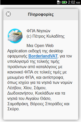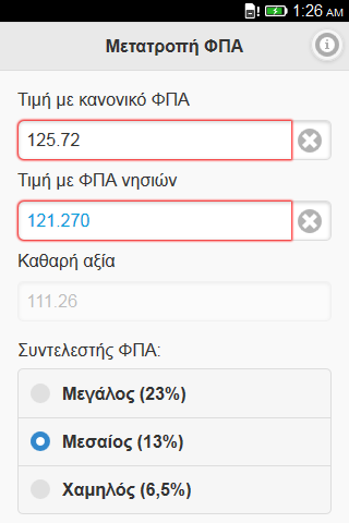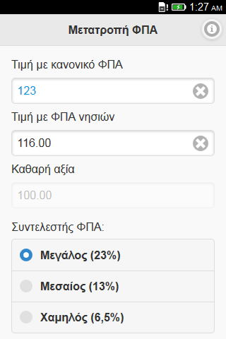 Υπολογισμός της τελικής τιμής προϊόντων από καταλόγους με κανονικό ΦΠΑ σε τελικές τιμές με μειωμένο ΦΠΑ, και αντίστροφα, όπως ισχύει για τα νησιά των νομών Λέσβου, Χίου, Σάμου, Δωδεκανήσου, Κυκλάδων και τα νησιά του Αιγαίου Θάσο, Σαμοθράκη, Βόρειες Σποράδες και Σκύρο. Η εφαρμογή, κάνοντας χρήση της τεχνολογίας appcache, μετά την εγκατάστασή της δεν απαιτεί σύνδεση στο δίκτυο για την λειτουργίας της, εκτός και αν διαγράψετε τα αποθηκευμένα δεδομένα του browser της συσκευής σας.