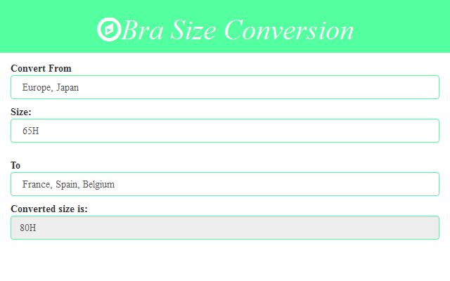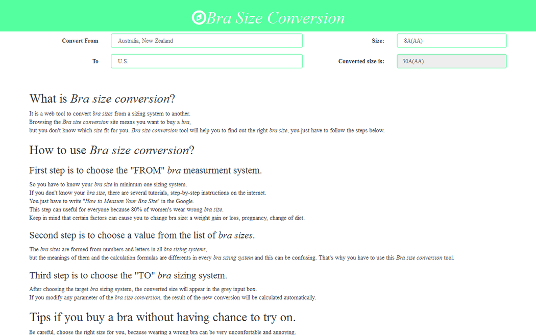 Bra Size Conversion is a web application to convert bra sizes between different measurement systems.It is very user friendly, you don't have to struggle with complicated bra size conversion tables