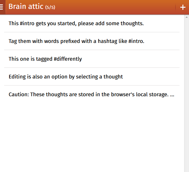 A place to store your thoughts. Quickly add any thought that comes to mind. Words prefixed with a '#' will be grouped under that tag. Tags will be automatically managed by the app, new tags are created, unused tags will be removed. Still on the roadmap: - Synchronisation between devices - Installation (detection) on Firefox OS - Keeping up to date with Firefox OS building blocks