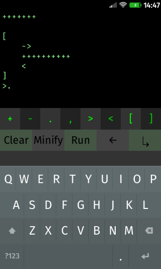 A simple brainfuck IDE. As Wikipedia says so well, brainfuck is "an esoteric programming language noted for its extreme minimalism". It is composed of eight (and only eight) operators and it is mainly designed for fun (though it is technically Turing-complete).