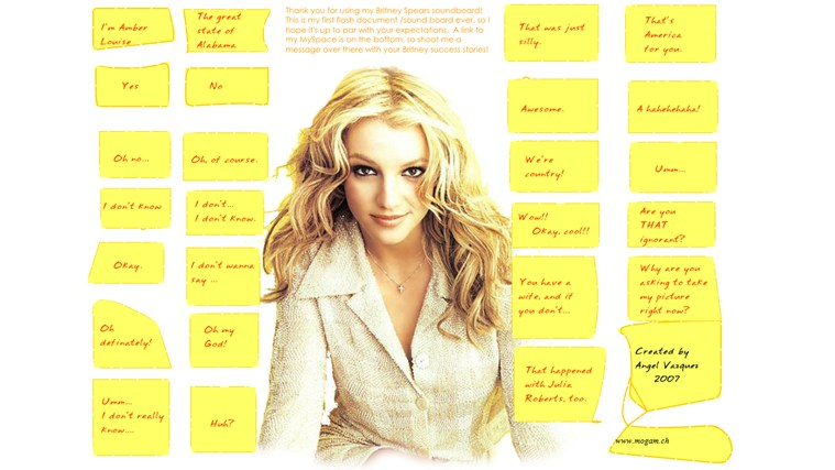 Awesome Britney spears fun soundboard app for your device! Html5 web app audio Over 25 sounds. Html5 audio movie stars effects. Britney spears lyrics audio phrases! Britney is a Grammy Award-winning pop singer, dancer, actress, author and songwriter. She's best known for her pop albums, music videos, and songs: