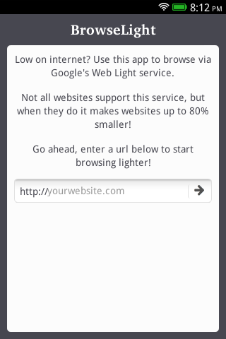 Save data and browse faster using Google's Web Light! Google Web Light is not very user-friendly (you need to append the url you want to visit to the Web Light url). This app does that for you, nothing more and nothing less! Note: this app uses the default Firefox browser on your device, but it conveniently redirects you to a Google Web Light Url. It's not an alternative browser for your device.