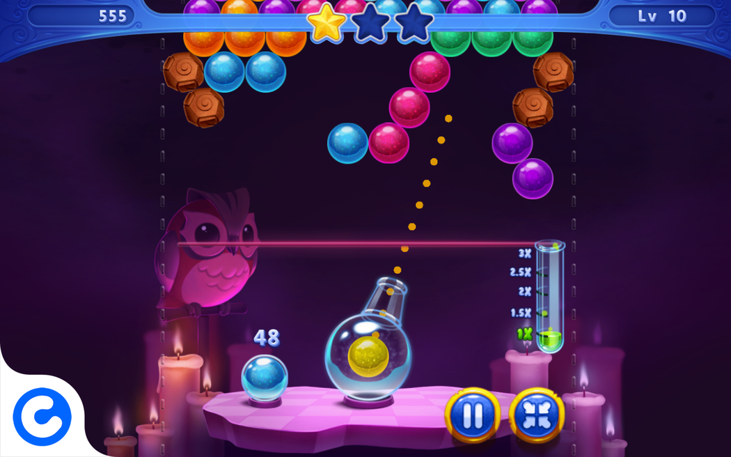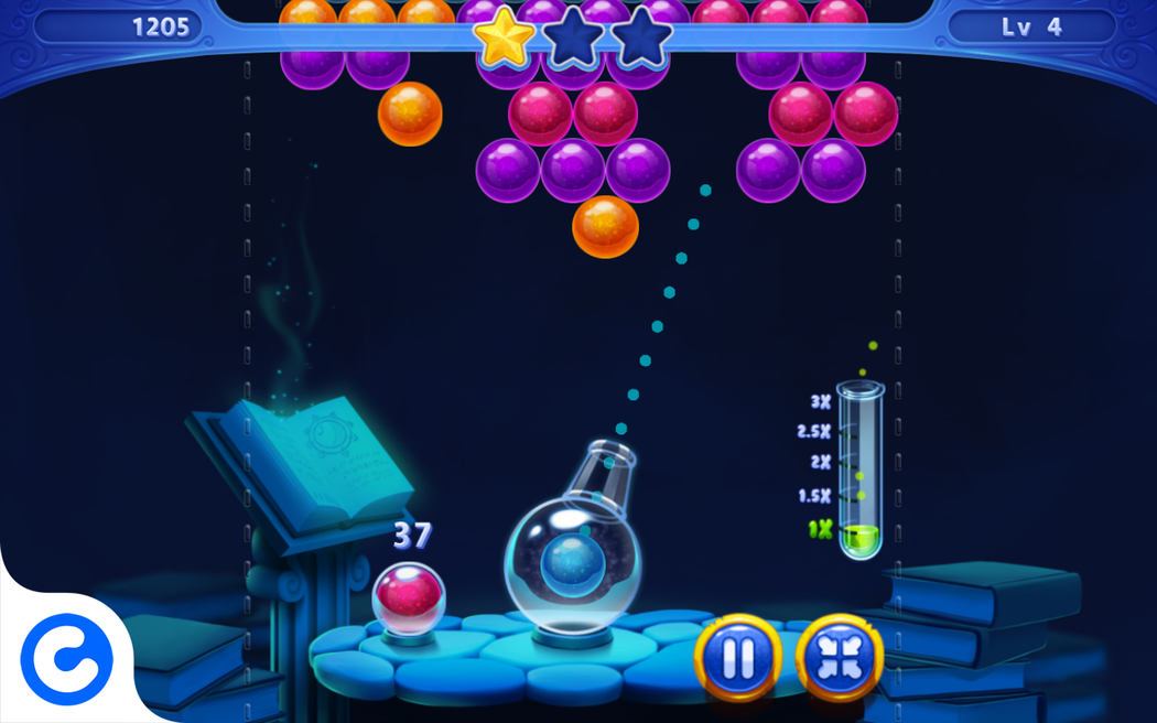 Shoot colorful bubbles with magical experiments. Follow classes at the Academy to learn all about magical bubble shooting and become top of your class! The mastery of magical bubbles is a mandatory subject at the Academy. All apprentices are expected a good understanding of the theory… but now it’s time for practice! Are you ready to test your bubble puzzle skills?