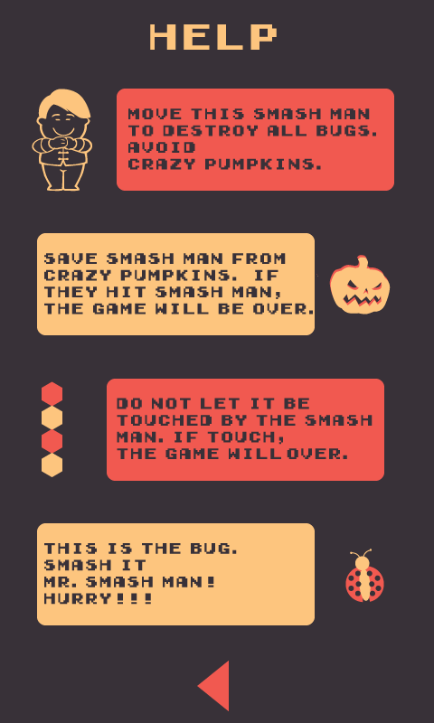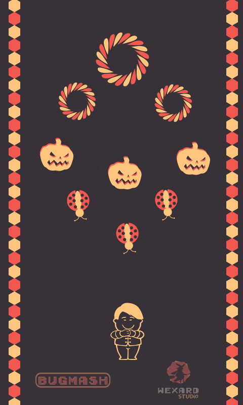 Plot: The main character of this game is smash man. There are falling crazy pumpkins and bugs on the main game. The smash man have to destroy bugs by avoiding crazy pumpkins. If any crazy pumpkin hits him or he hits the moving wall; the game will be over. If smash man misses any bug, his life will be reduced 1% each time. Suitable: This game is available for 3+ age group. This project is done by WEXARD STUDIO. MADE IN BANGLADESH.