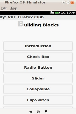 Introduction to basic constructs which helps you in developing the Firefox OS App. The main goal of this app to teach new FirefoxOS app developers, how to use basic UI constructs (such as radio buttons, checkboxes, sliders, etc) in their apps.