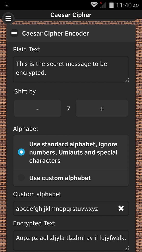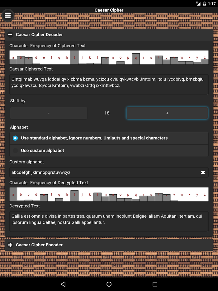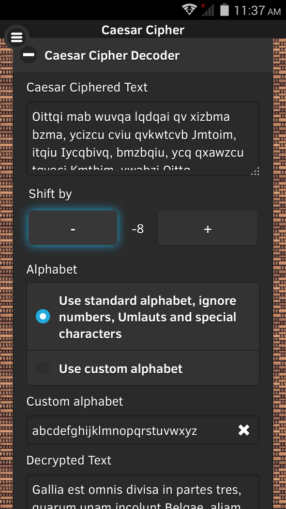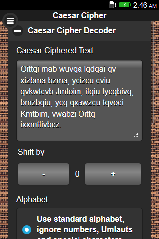 Caesar Cipher / Shift Cipher encryption technique based tool. The basic concept of the Caesar Cipher is one of the encryption techniques that is said to have been used by Gaius Iulius Caesar (*July 100BC; †March 15th, 44BC) to protect message exchange among his military troops. Caesar Cipher encryption is basically performed by monoalphabetic character substitution. Substitution is performed by applying a positional shift in a given alphabet. Reversing the shift by same amount of positions with same alphabet decrypts the ciphered text into plain text again. Such that the secret key in this symmetric cipher is represented by