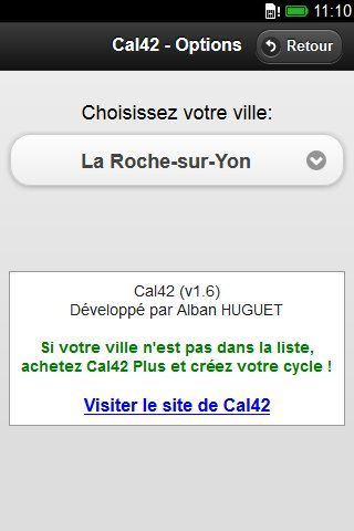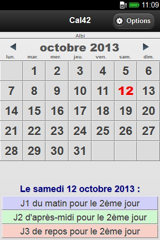 Calendrier Cal42 est un calendrier pour les cycles de travail non hebdomadaires. Cal42 permet à toutes les personnes qui travaillent sur des cycles non hebdomadaires, tels que les "4/2" (4 jours de travail et 2 jours de repos) de savoir comment elles travailleront à une date donnée. Cal42 s'adapte également à tous les corps de métier ayant des cycles de travail tels que 3/3 ou tout autres cycles. Développé par Alban HUGUET Tous droits réservés Alban HUGUET 2012.