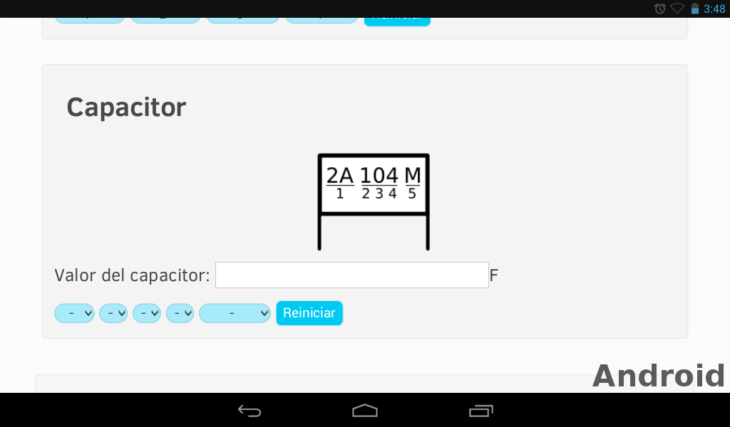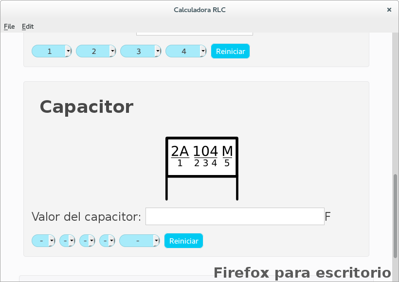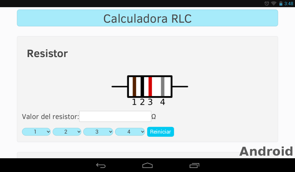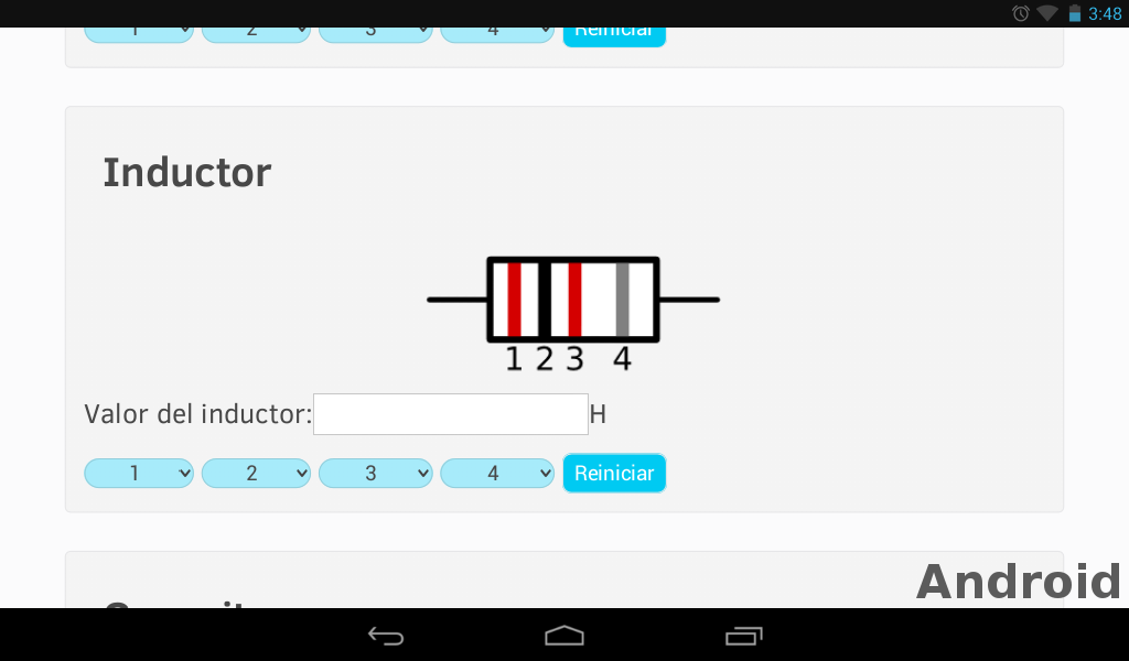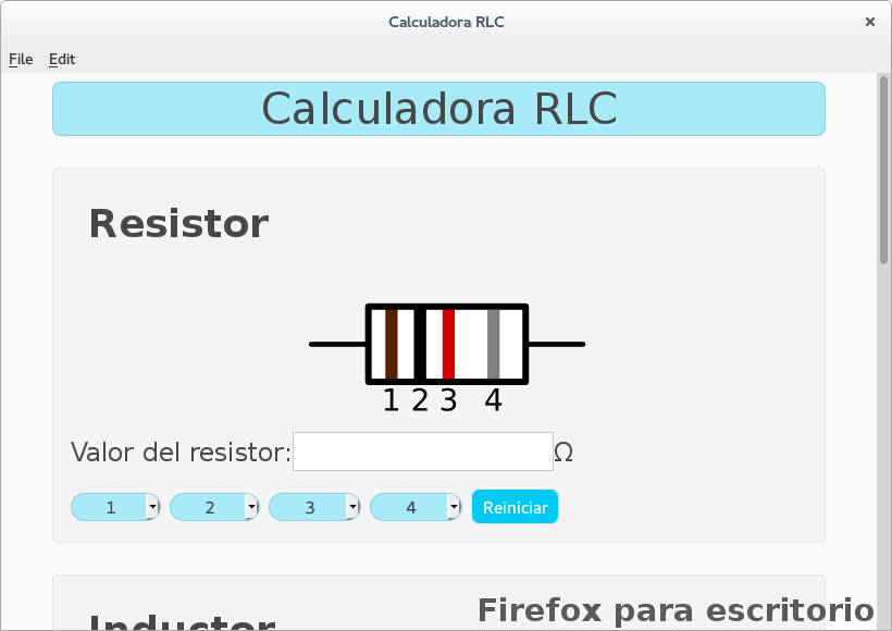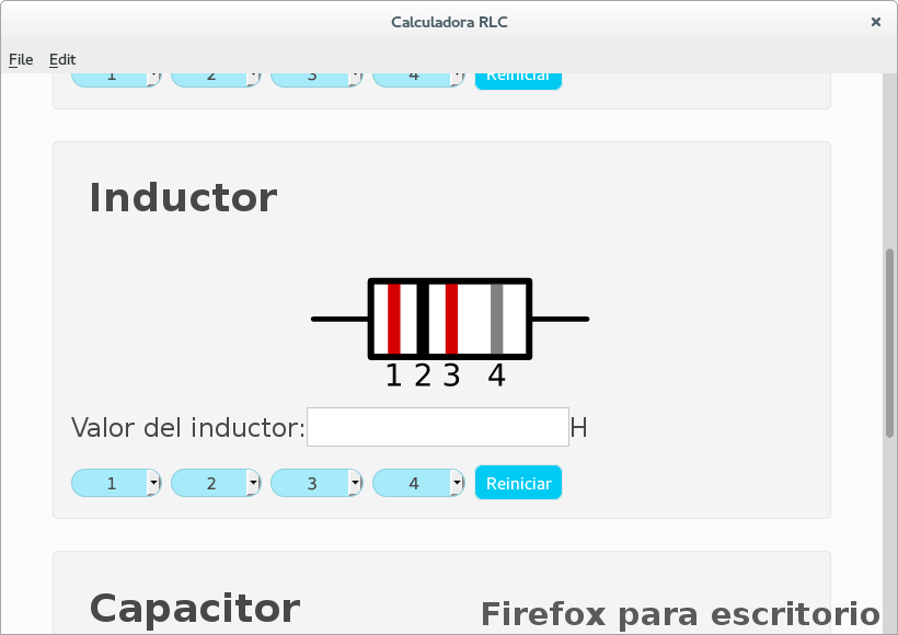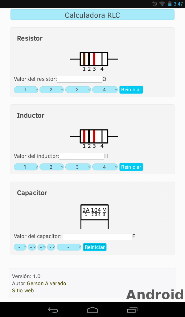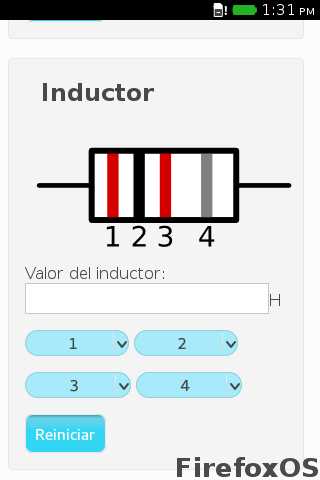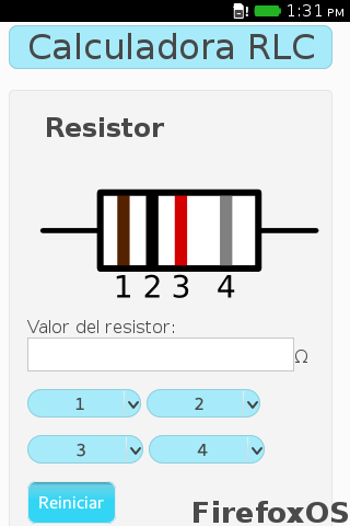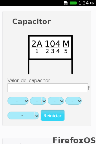 Conoce el valor de los resistores, condensadores (capacitores) e inductores. Compatible con - Firefox OS. - Firefox para Android. - Firefox para escritorio (Windows - GNU/Linux - Mac OS). V 1.0 - Resistores e inductores con código de color. - Capacitores con código alfanumérico. Si encuentran algún error o tienen alguna sugerencia para mejorar la aplicación, no duden en publicarla.