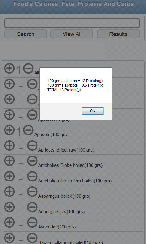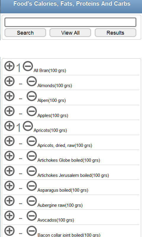 The following app provides details of the energy (Kilo Calories), Proteins (grs), Carbohydrates (grs) and Fats (grs) for 100 grs of various foods.