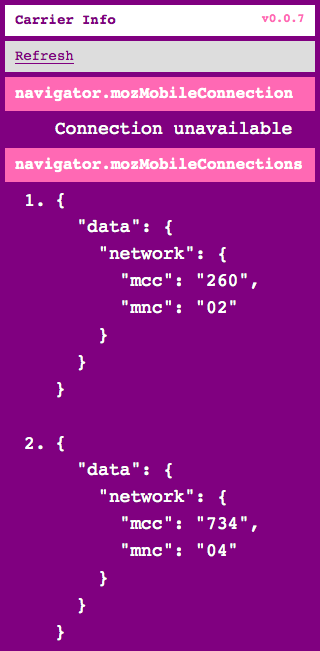 Inspect the contents of `navigator.mozMobileConnection` and `navigator.mozMobileConnections` APIs.